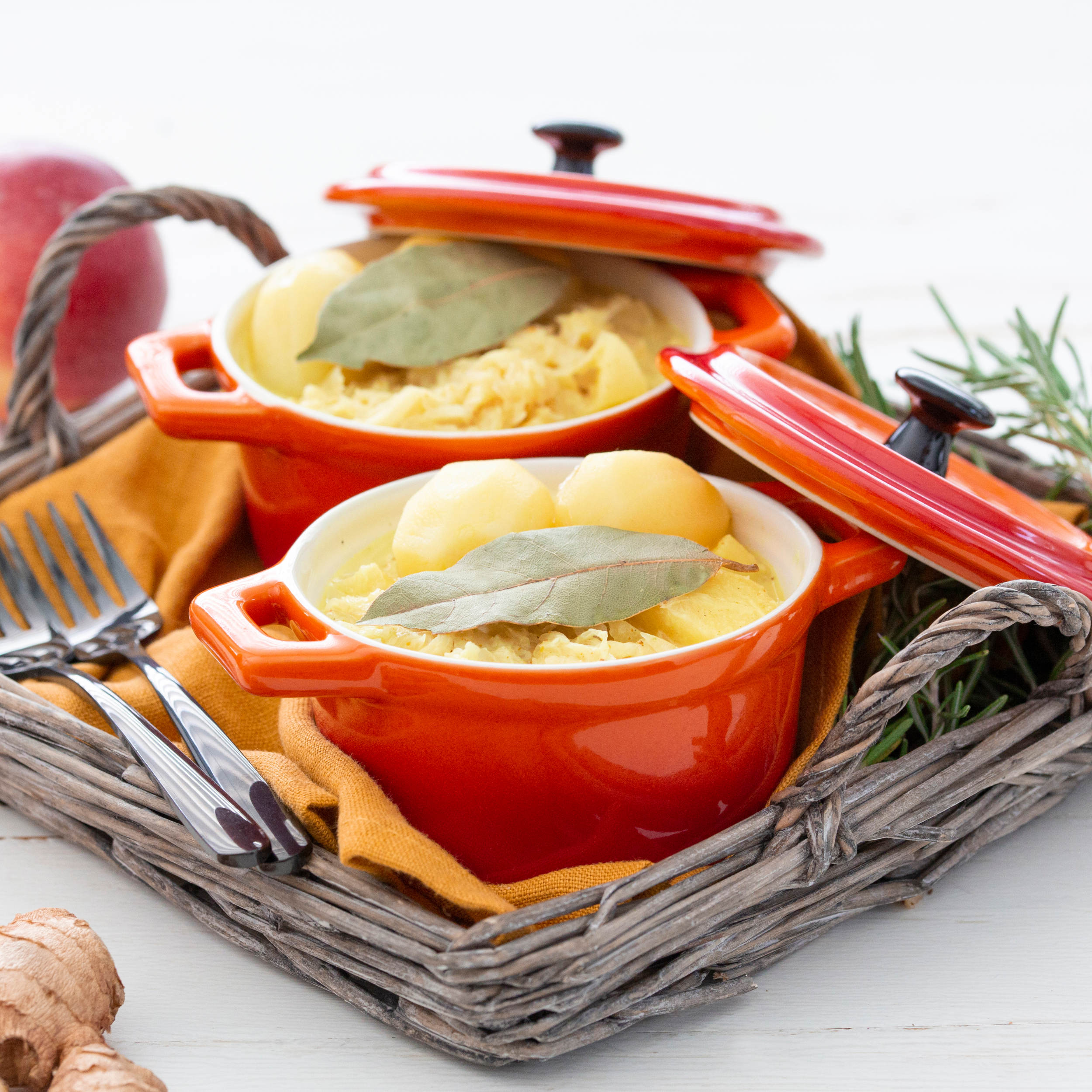 Das Apfel Sauerkraut Curry abschmecken, in Schalen füllen, mit Lorbeerblatt garnieren und mit den Beilagenkartoffeln servieren.