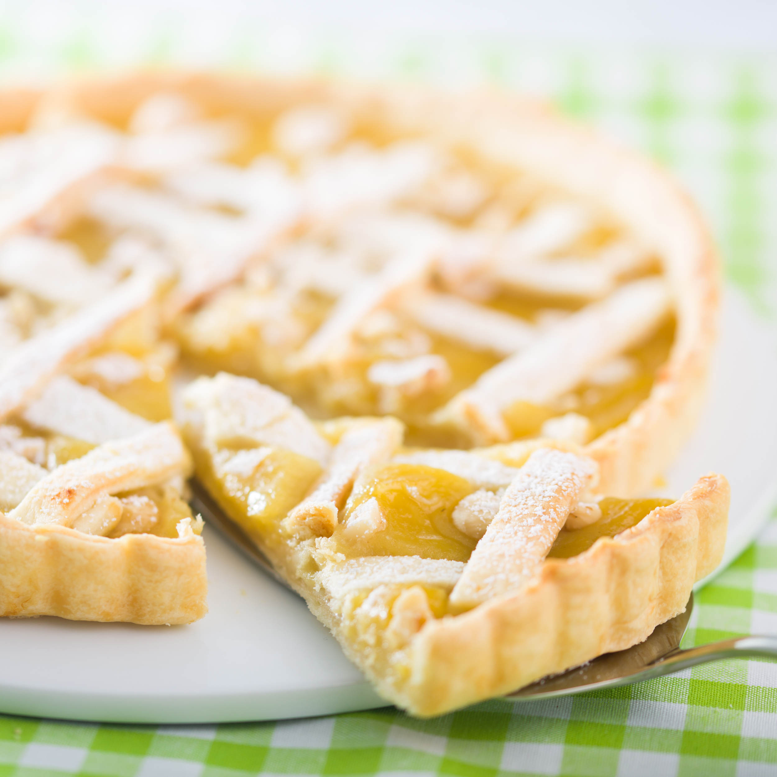 Die Teigenden in ca. 0,5 cm breite Streifen schneiden und die Apfelmustarte damit gitterförmig belegen. Die Tarte im vorgeheizten Backofen circa 40 Minuten goldbraun backen.