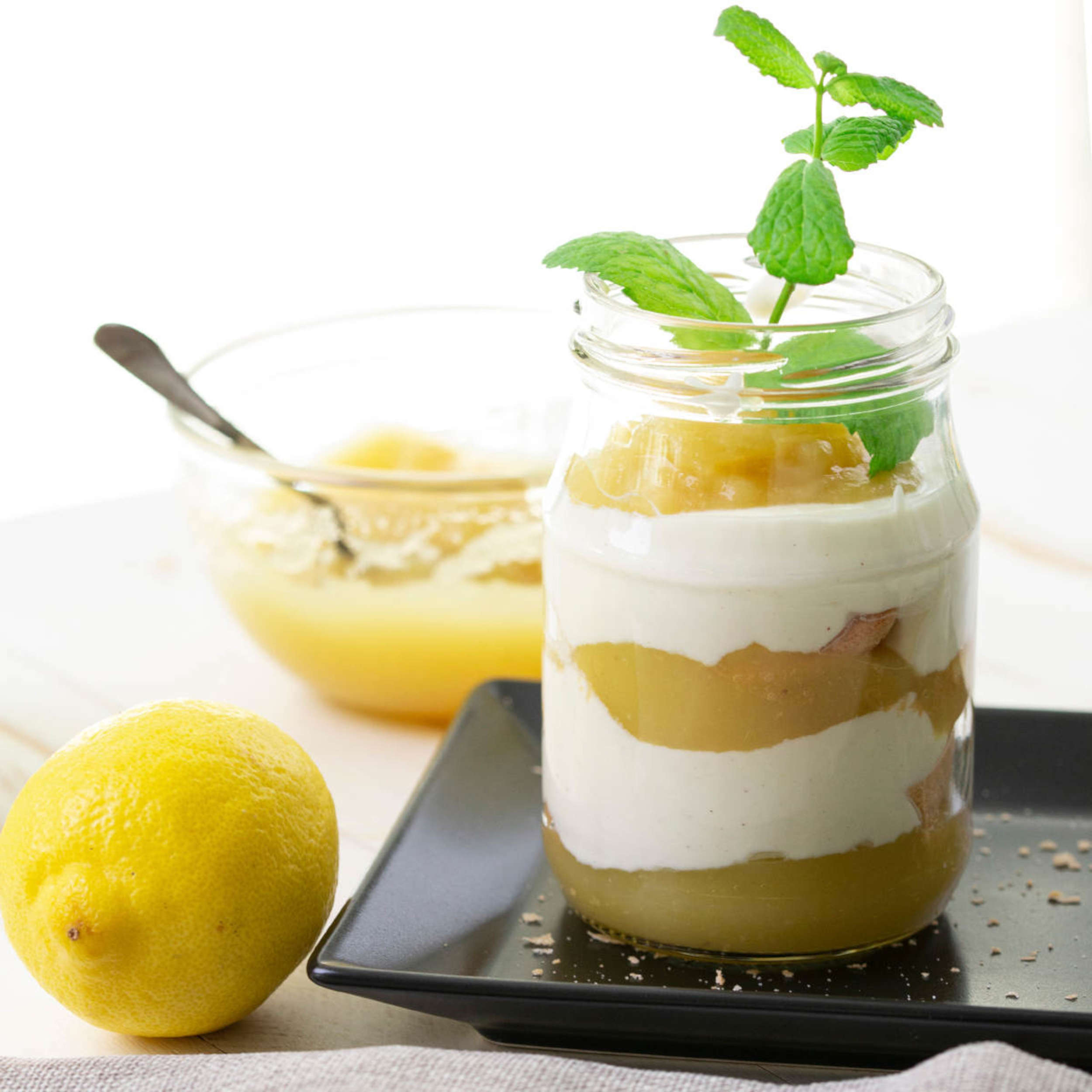 Naturjoghurt mit Mascarpone, Vanillezucker, Staubzucker und etwas Zitronenabrieb glatt rühren und abschmecken. 2 Gläser abwechseln mit einer Schicht efko Birnenmus, Biskottenstücken und Joghurt-Mascarpone-Creme füllen und mit Minze garnieren.