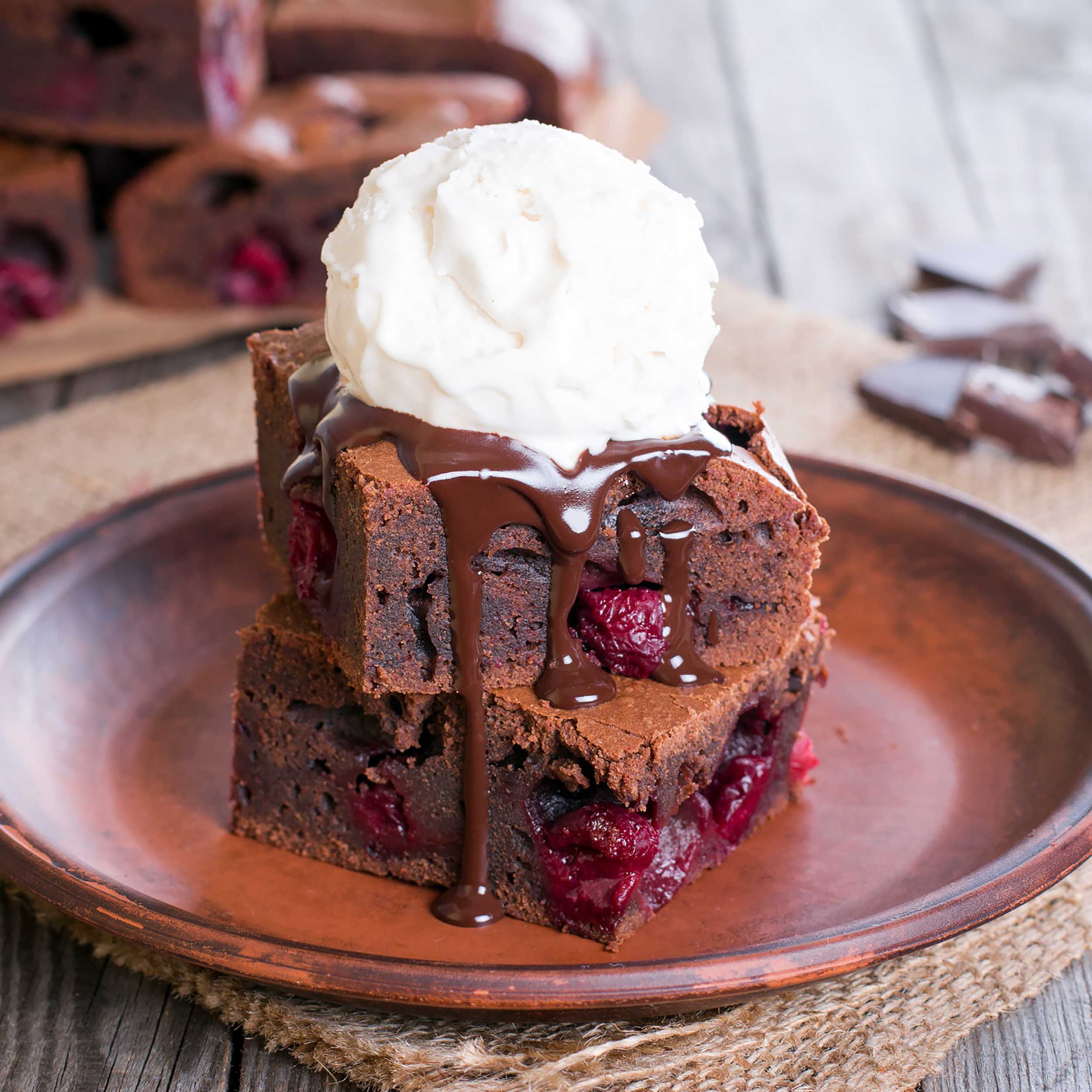 Weiche Butter mit Zucker und Vanillezucker aufschlagen, die Eier unterrühren und Milch beigeben. Mehl und Backkakao unterrühren. Die geschmolzene Schokolade mit den halbierten Kirschen beimengen. Den Teig am Backblech gleichmäßig verteilen verteilen. Die Brownies ca. 40 Minuten backen und danach auskühlen lassen.