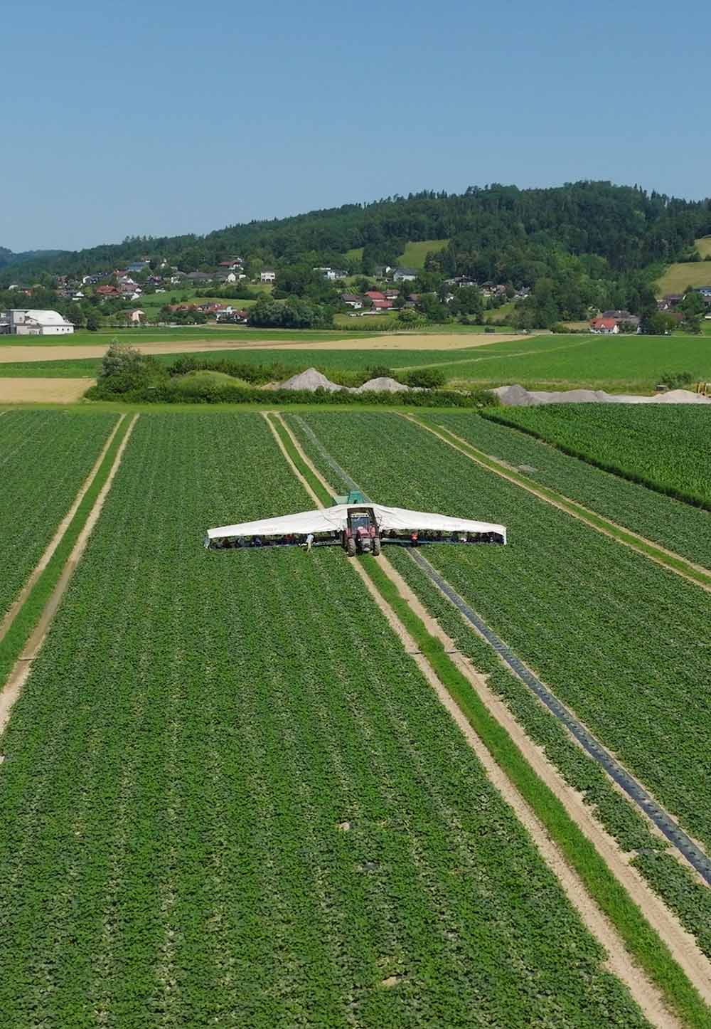 Für die Ernte wird der sogenannte „Gurkenflieger“ von einem Traktor über das Feld gezogen. Auf jedem Gurkenflieger liegen Personen, die die Gurkerl per Hand ernten. Ist der Anhänger voll, werden die Rohwaren zur Weiterverarbeitung direkt zu efko geliefert. Durch den schnellen Vorgang bleiben die Gurkerl besonders knackig.