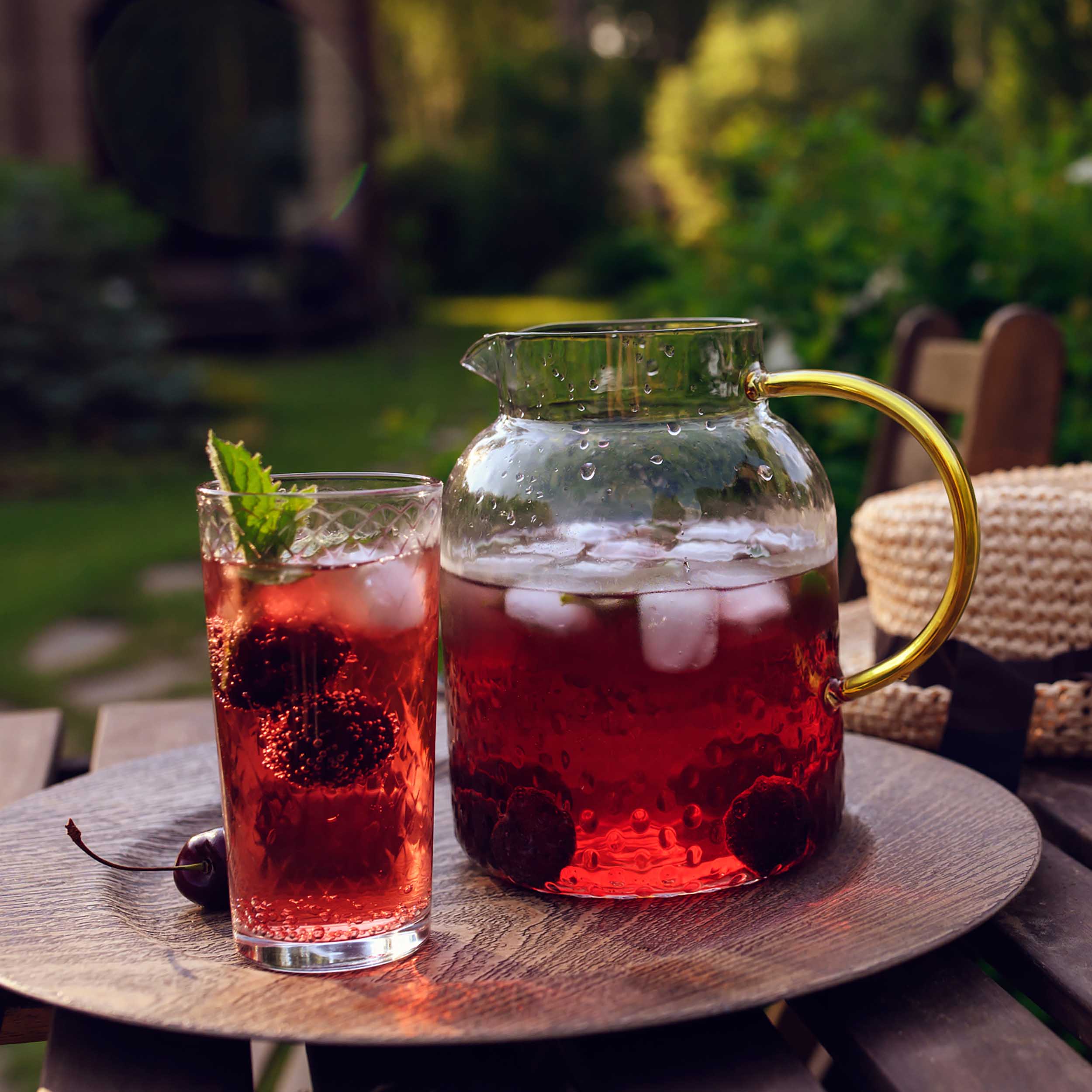 Kirschen abtropfen lassen. Den Saft auffangen und gemeinsam mit dem Saft einer halben Zitrone in einen Krug füllen. Kirschen und andere beliebig viele Früchte der Saison waschen, schneiden und in den Krug hinzufügen.