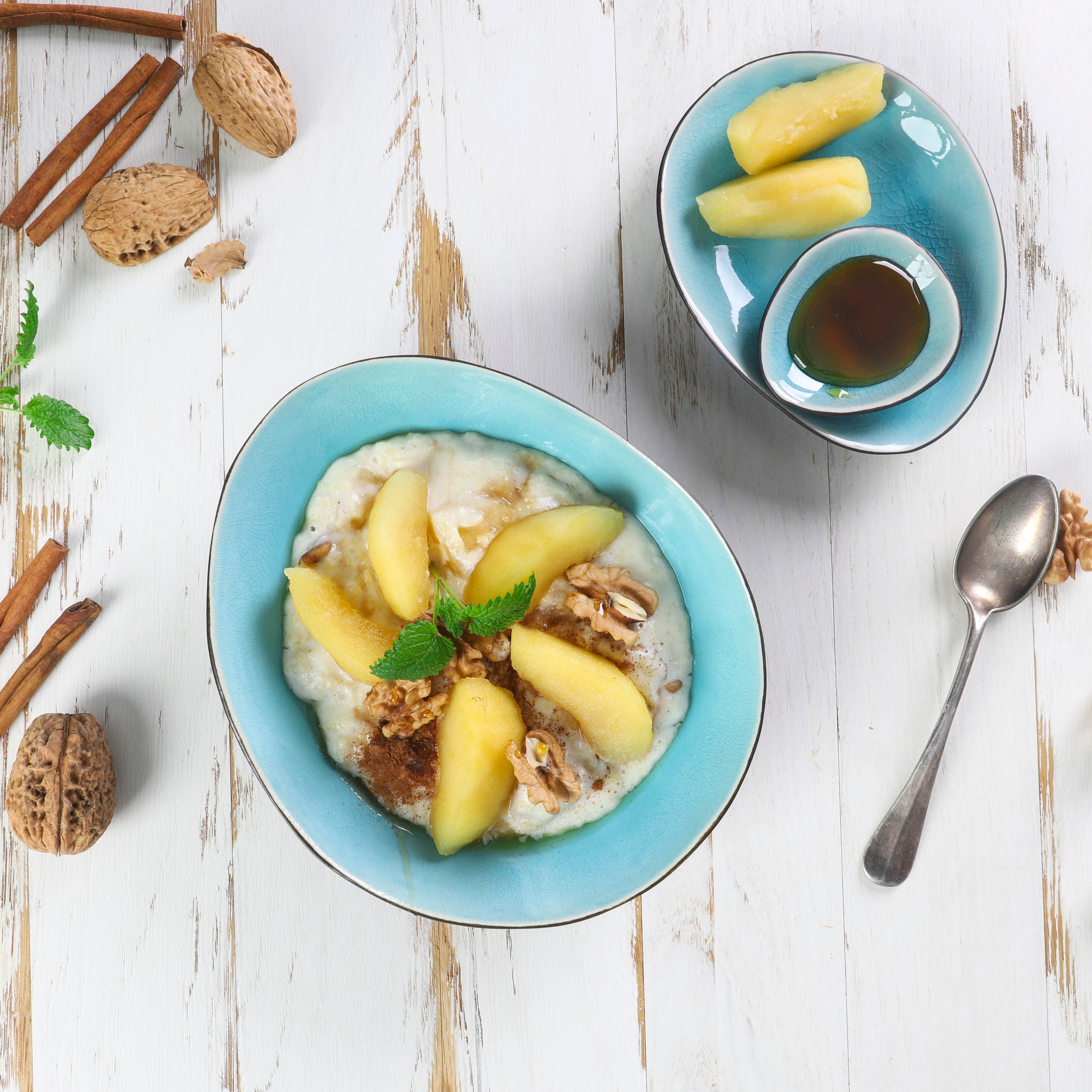 Das Porridge in Schüsseln füllen, mit einer Prise Zimt bestreuen und mit den restlichen Apfelstücken und Wallnusskernen garnieren. Wenn gewünscht etwas Honig darüber träufeln und mit frischer Melisse garnieren.