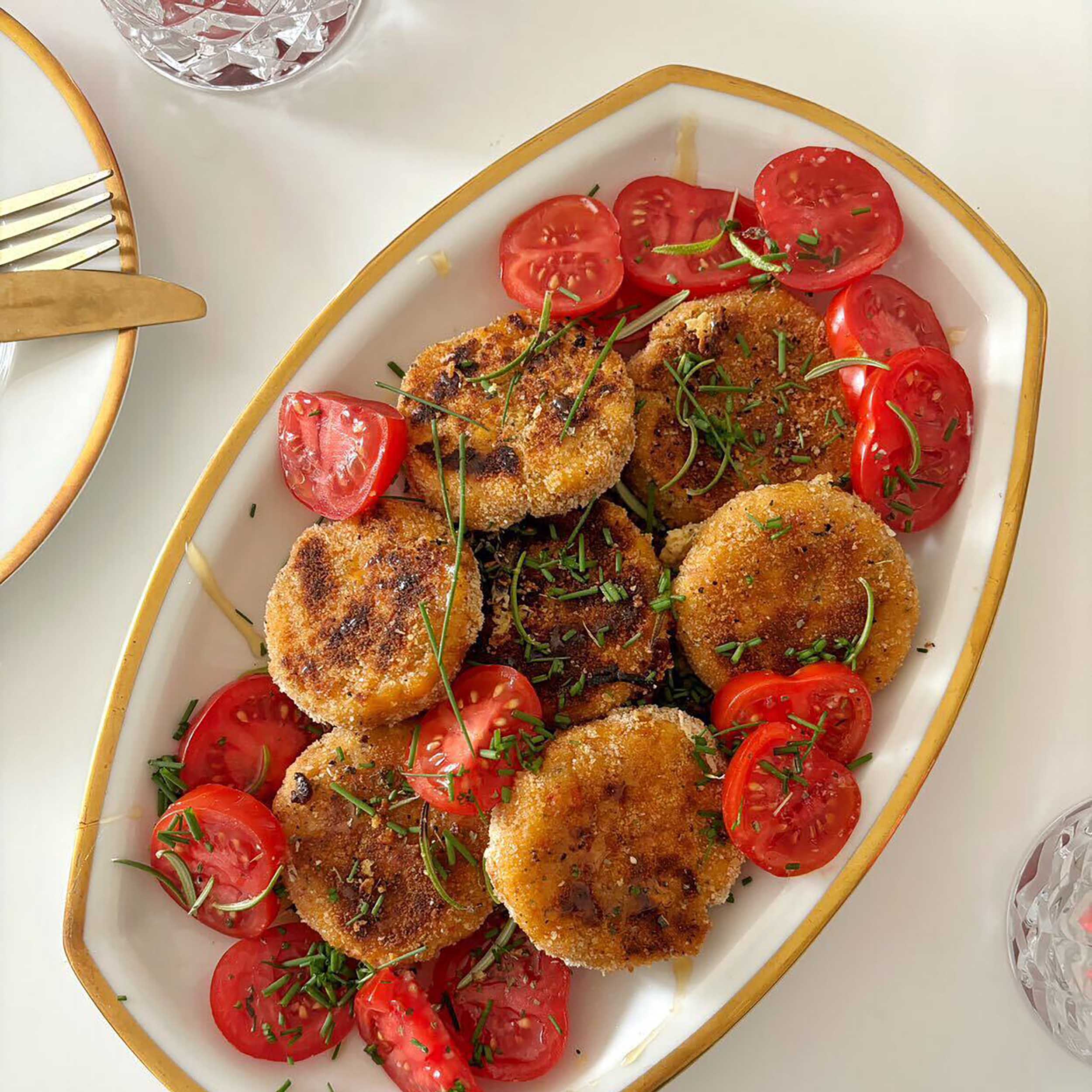 Die efko Kartoffel Jause mit Tomate in eine große Schüssel geben und dazu Ei, Mehl, Paniermehl, Salz und Pfeffer hinzugeben. Alles mit den Händen gut durchkneten.