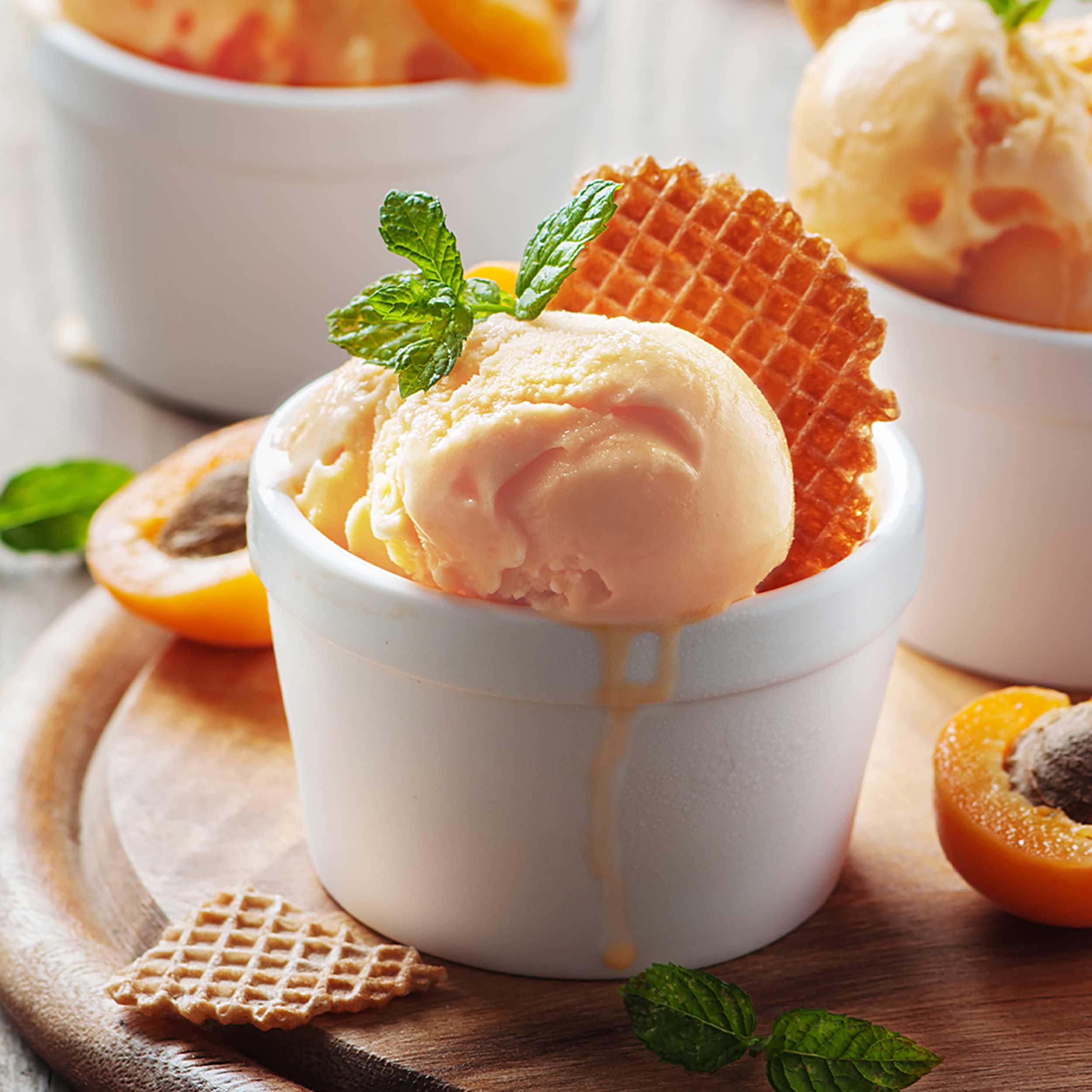 Das Eis in kleine Schüsseln portionieren und mit frischer Minze und Waffeln dekorieren.