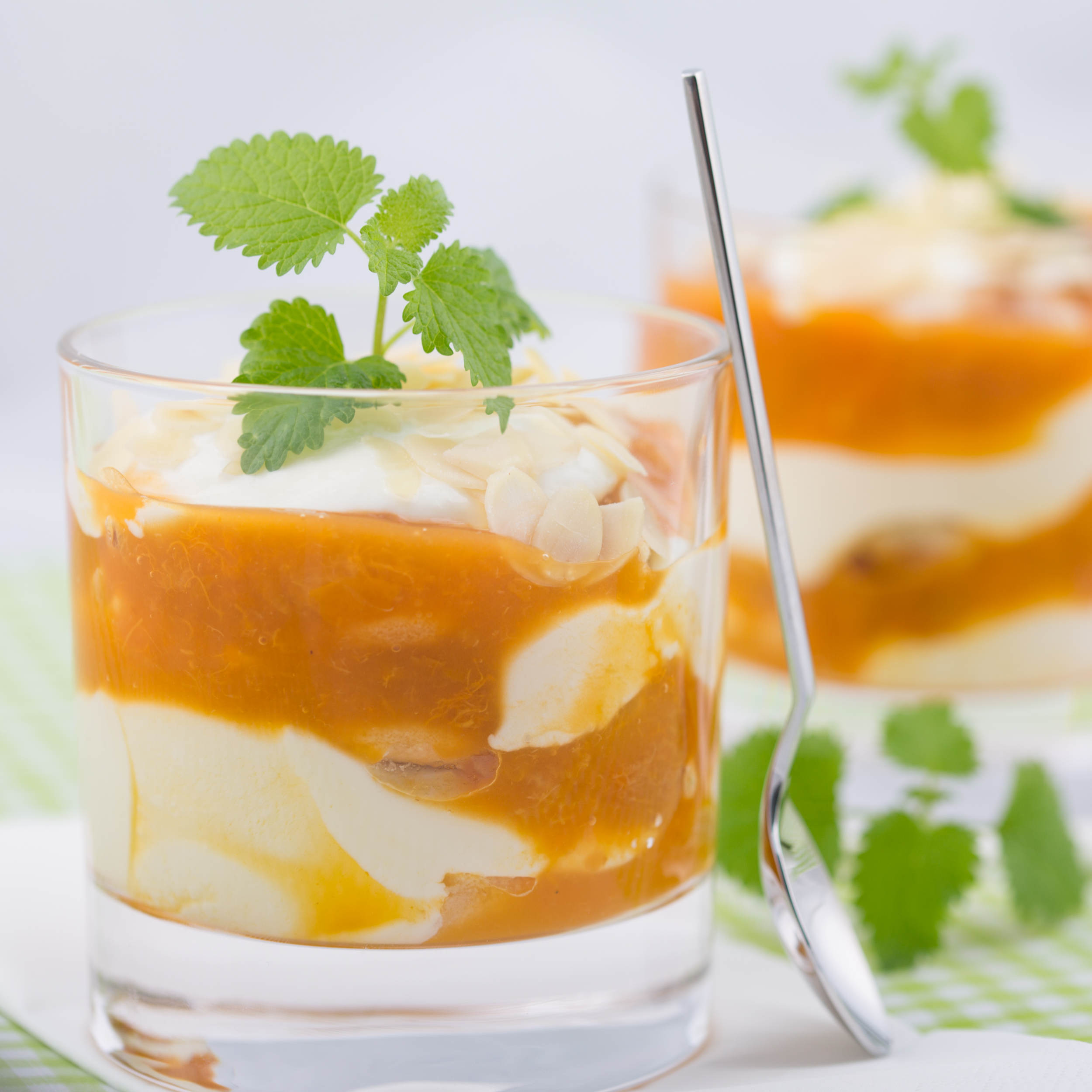 Die Biskotten in der Mitte teilen, ins Glas legen und mit etwas Marillensaft beträufeln. Nun 2 Esslöffel Mascarpone-Joghurt Creme und 2 Esslöffel efko Marillenröster ins Glas schlichten. Den Vorgang wiederholen. Zuletzt mit gehobelten Mandeln garnieren.