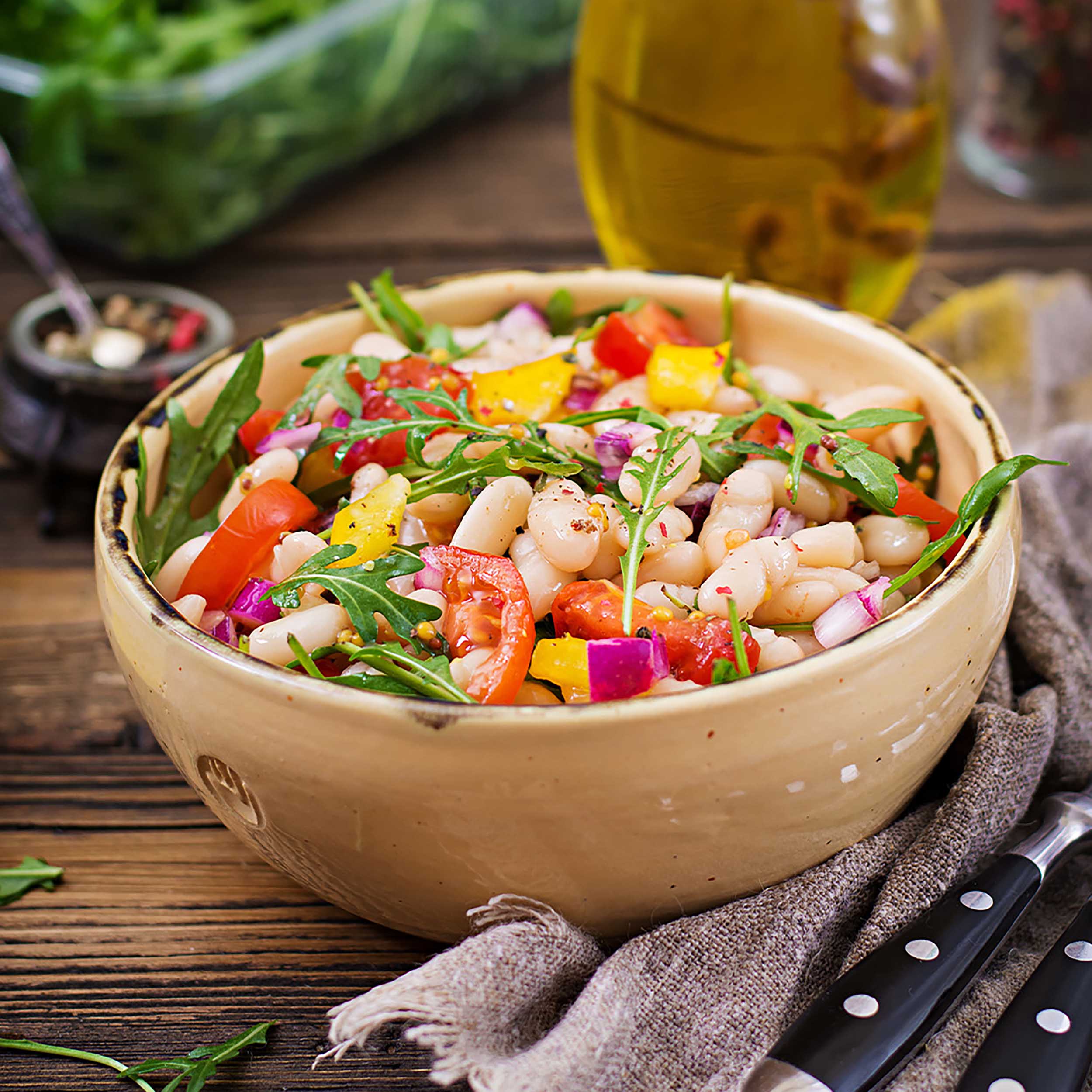 Zwiebel kleinwürfelig schneiden. Die Tomaten in Spalten und den gelben Paprika in Würfel schneiden. Den efko Bohnensalat in eine Schüssel leeren, mit dem geschnittenen Gemüse vermischen und mit frisch gepresstem Zitronensaft, Olivenöl und schwarzem Pfeffer abschmecken.