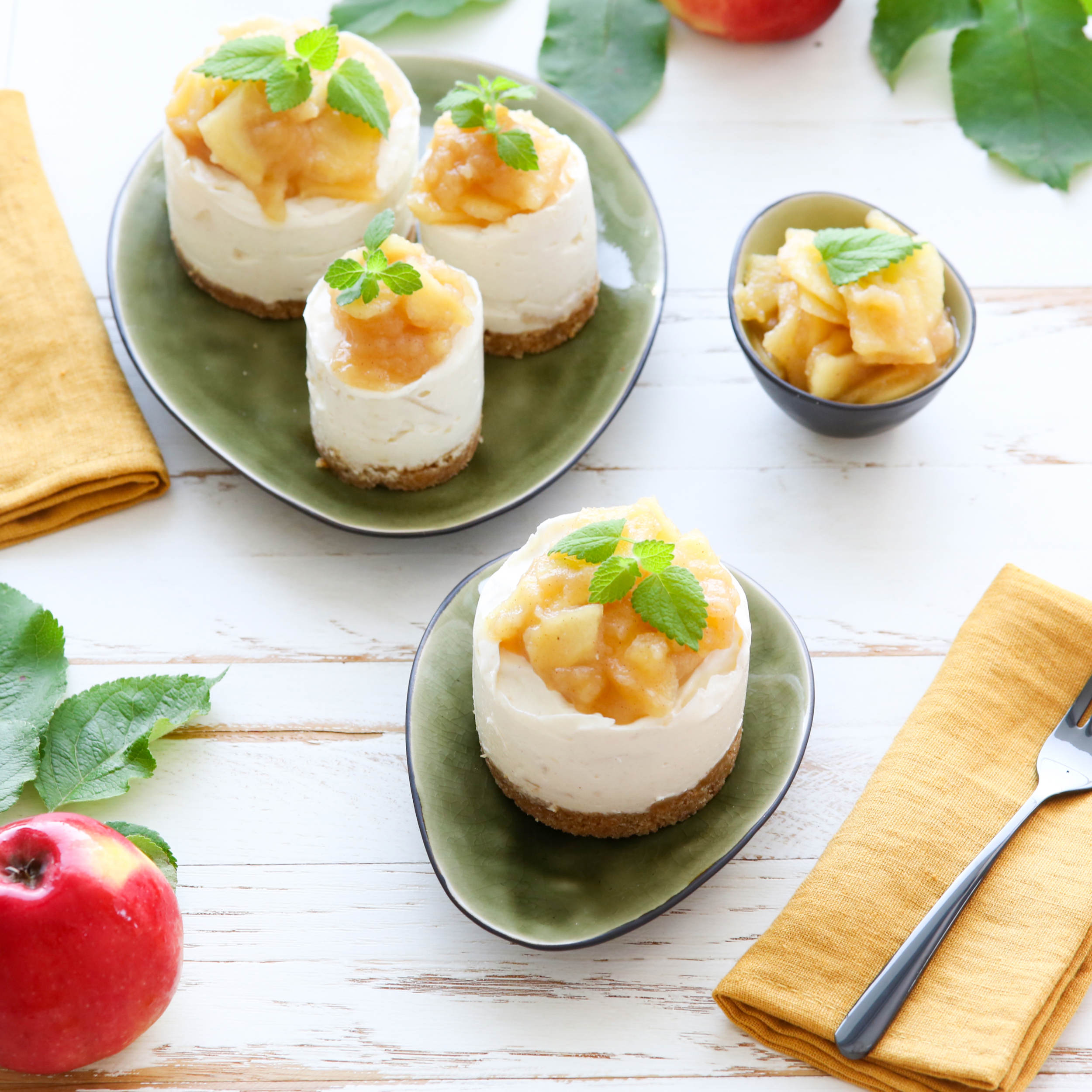 Zum Servieren die Mini-Kuchen vorsichtig mit einem Messer vom Rand lösen, aus den Dessertringen heben, auf die Teller geben und mit der restlichen Apfelstrudelfülle und mit Minze garnieren.
