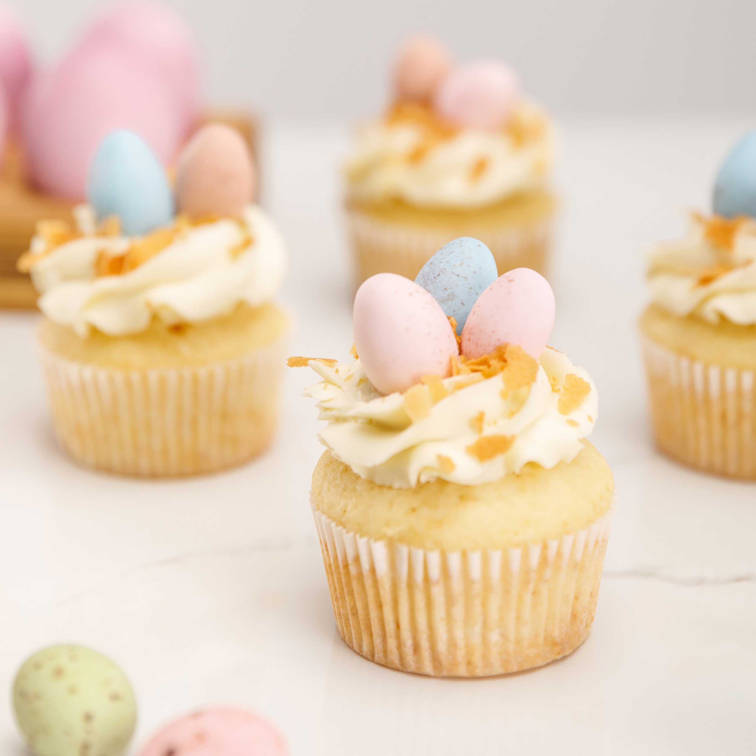 Die köstlichen Cupcakes mit Schlagobers oder Vanillecreme und Tortendekoration verzieren und servieren.
