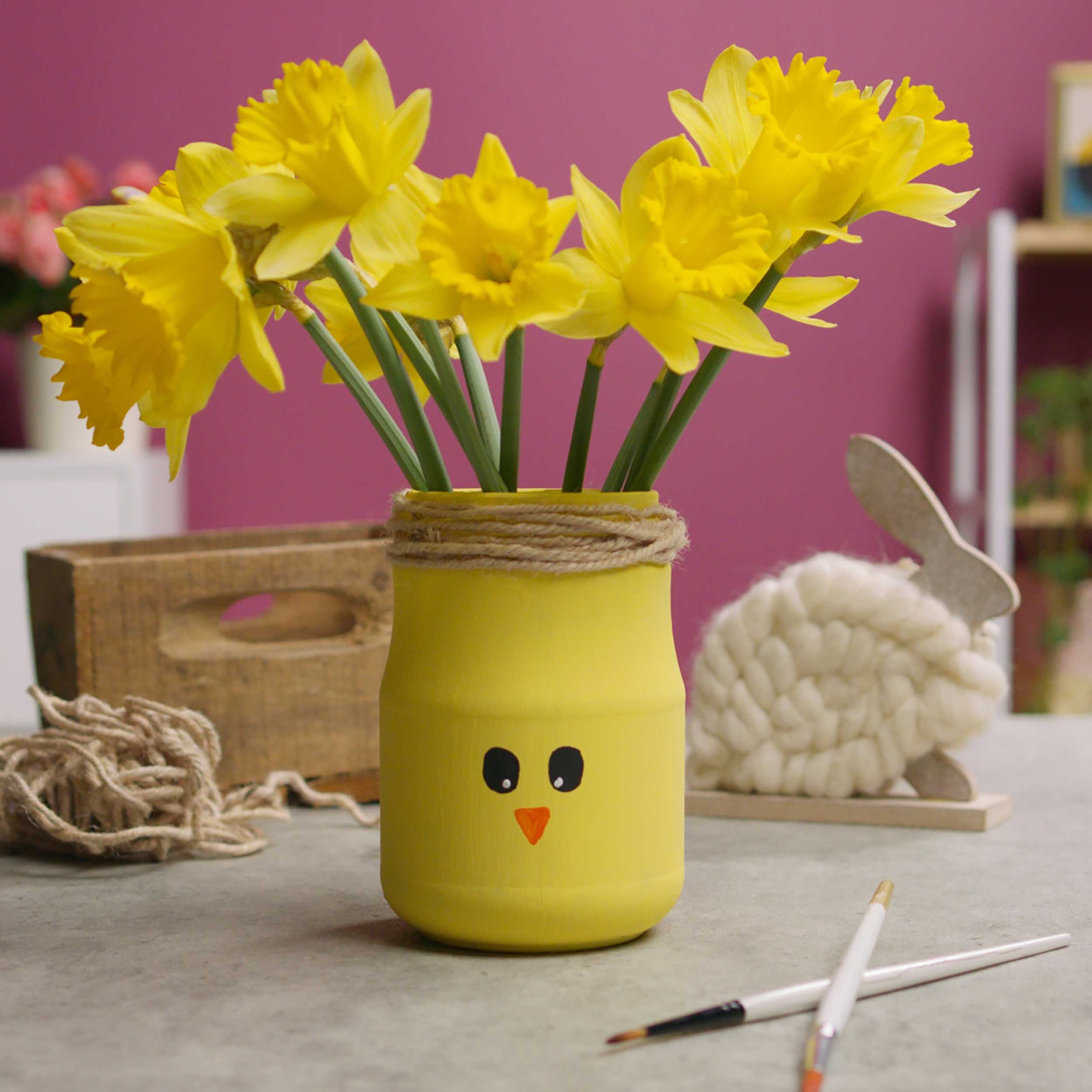 Das leere Glas außen mit gelber Farbe bemalen und trocknen lassen. Mit einem dünnen Pinsel Augen und Schnabel aufmalen. Anschließend die Kordel ein paar mal um den oberen Glasrand wickeln und gut festkleben.