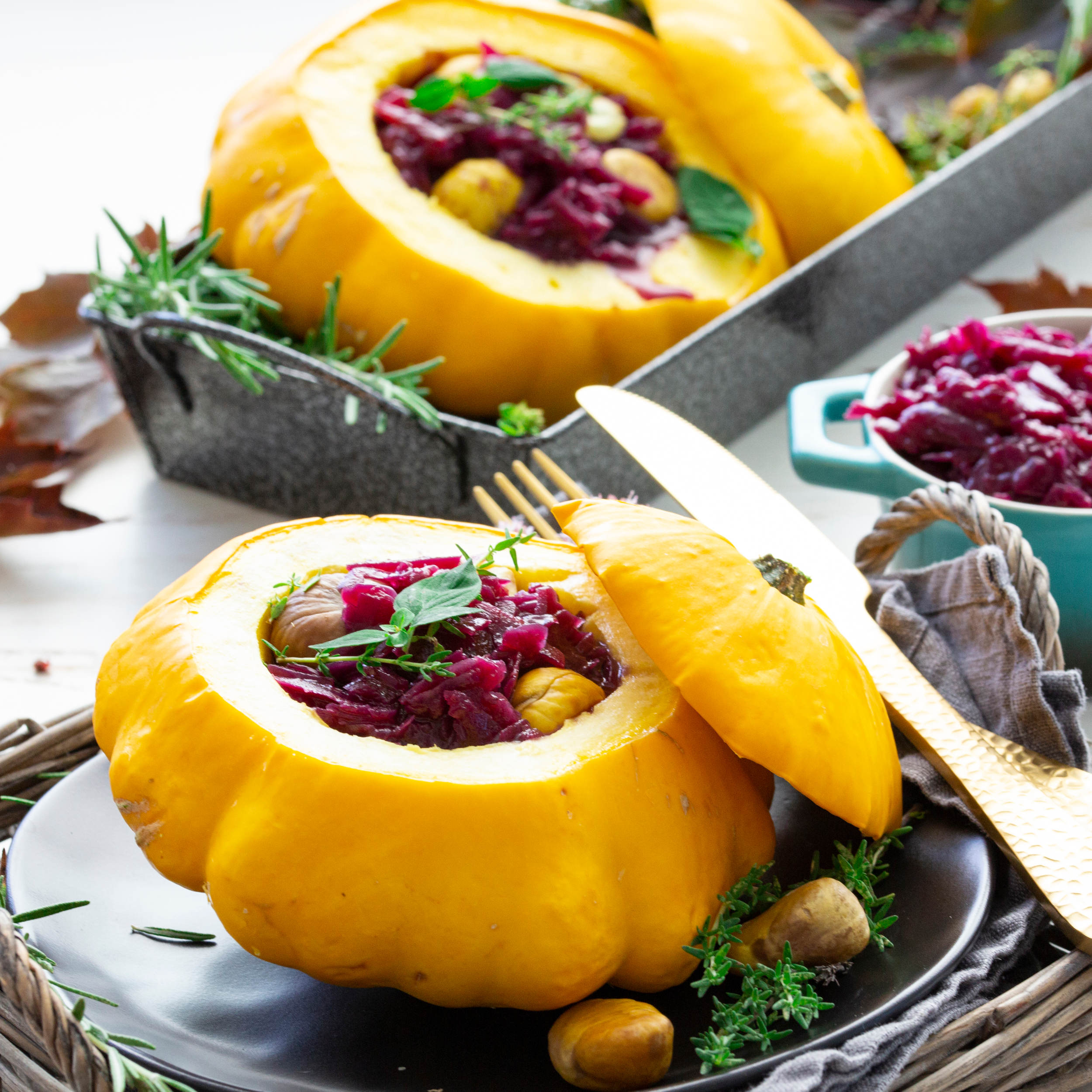 Die Kürbisse aus dem Backofen nehmen. Das efko Rotkraut mit den Maroni in einer Schüssel vermengen, die Kürbisse damit befüllen und weitere 15 Minuten im Backofen garen.