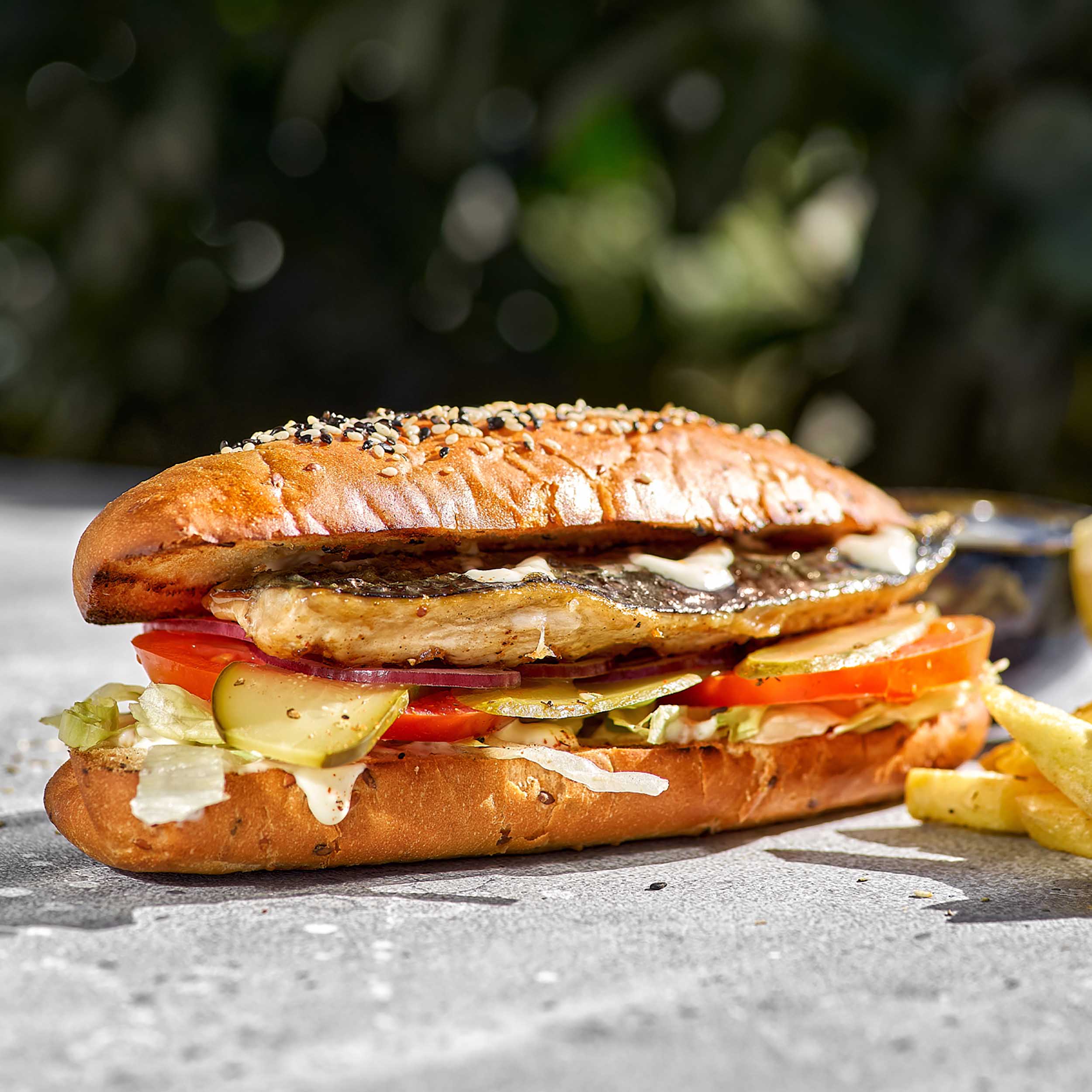Die Brötchen mit der Joghurt-Sauce bestreichen. Salat, Zwiebelringe, Tomaten- und Gurkerlscheiben auf den Brötchen verteilen. Den gegrillten Fisch darauf legen. Zum Schluss noch einmal etwas Joghurt-Sauce über den Fisch geben und das Brötchen zuklappen.