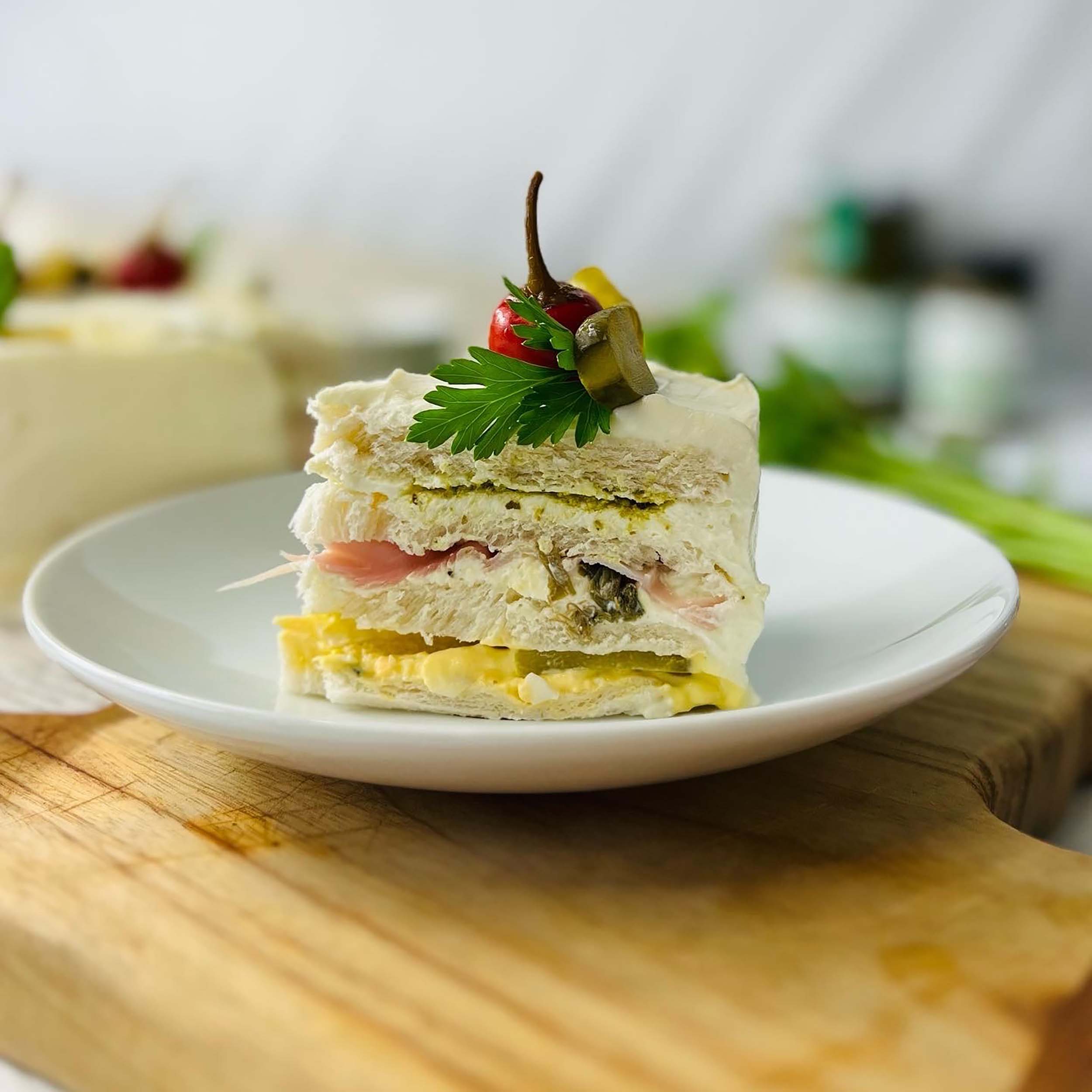 Nach dem Kühlen die Torte aus dem Tortenring schneiden mit der restlichen Creme einstreichen und nach Lust und Laune mit Essiggurken, Kirsch-Pfefferoni, Kapern, Silberzwiebeln und Knoblauch dekorieren.