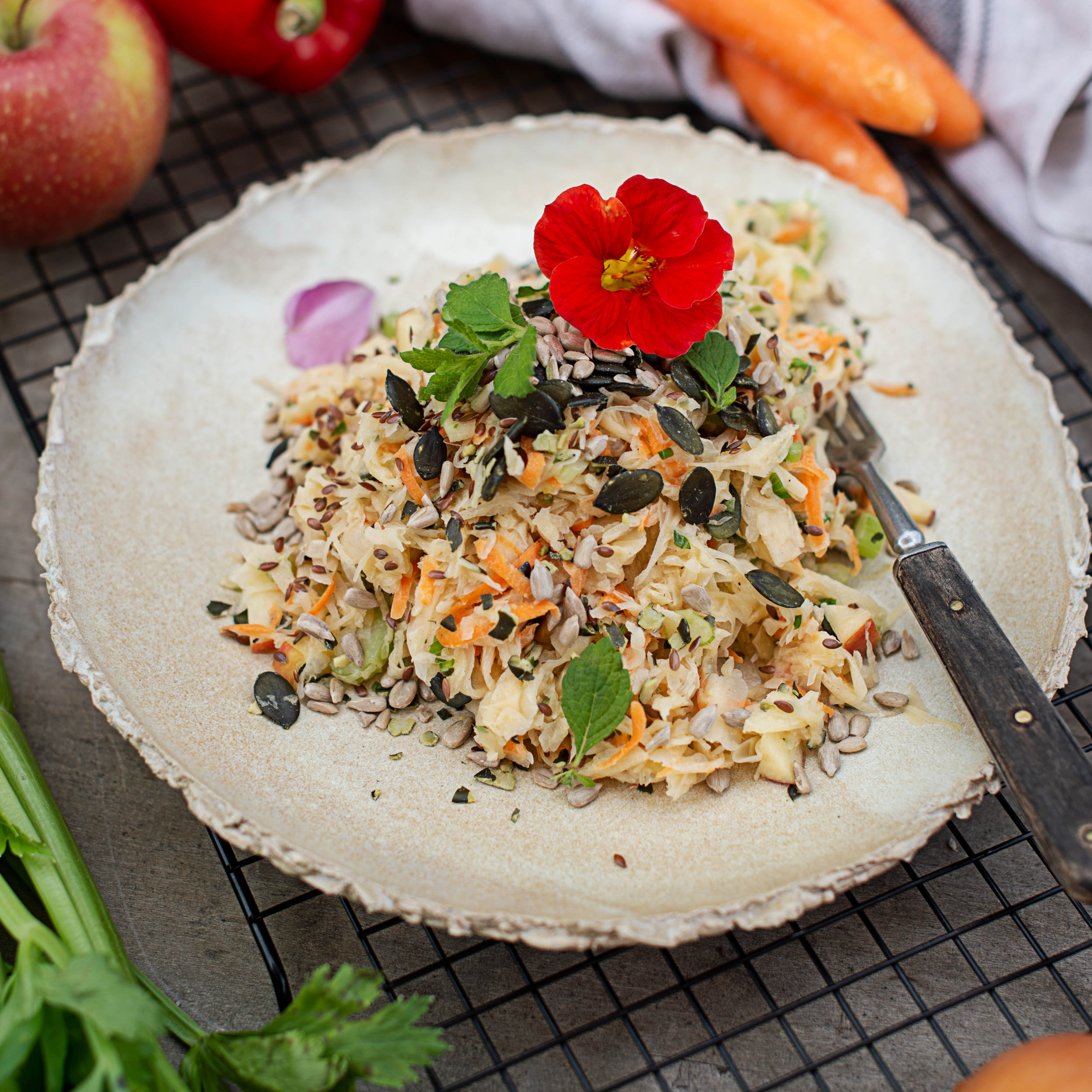 Für einen milderen Geschmack das Kraut gerne ausdrücken oder sogar auswaschen. Apfel, Karotte und Stangensellerie waschen, putzen und fein raspeln. Gemeinsam mit dem Kraut, Kürbiskernen und optional mit Heidelbeeren auf einem Teller anrichten.