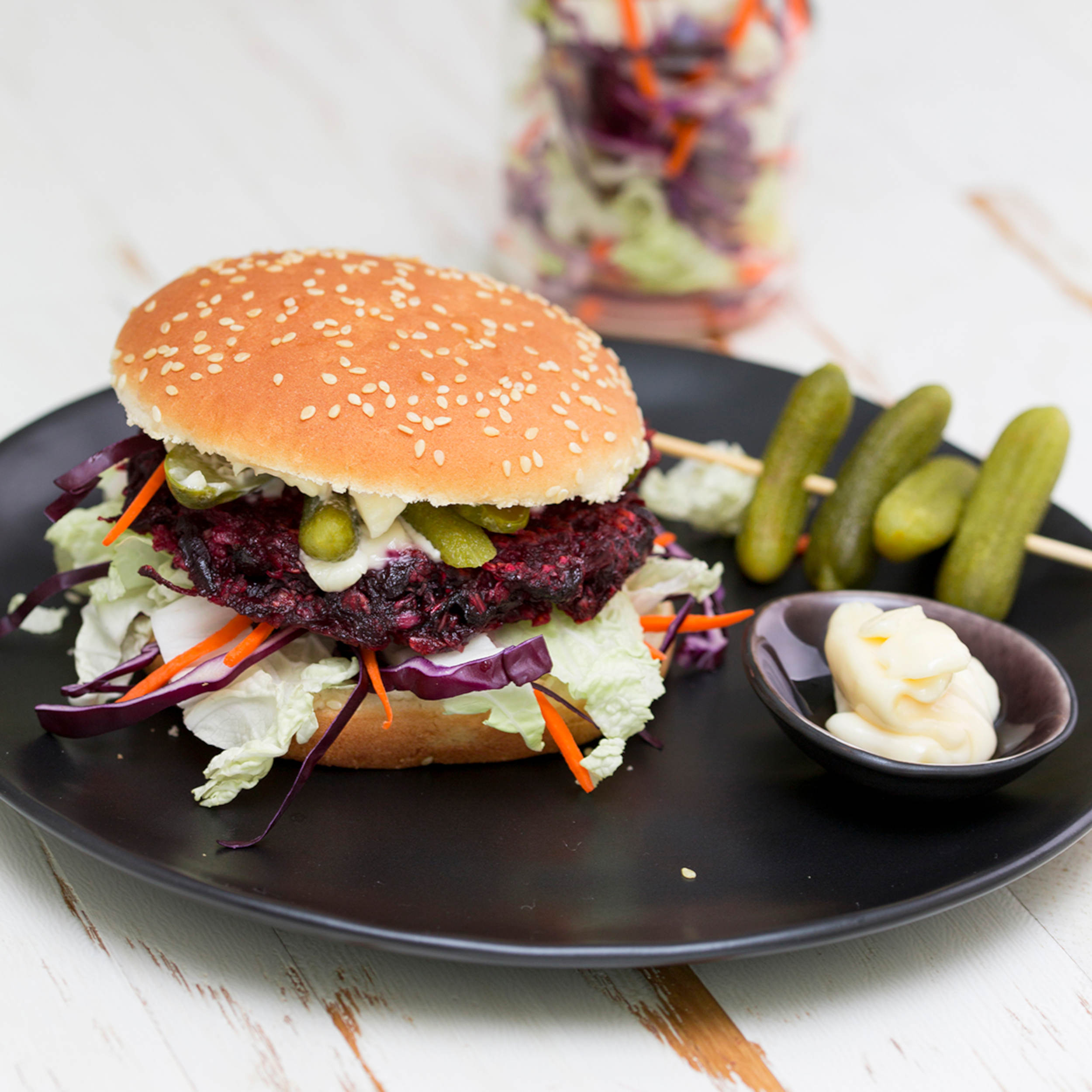 Die Burger Buns halbieren und den essfertigen Wintersalat großzügig auf den Burger Bun Böden verteilen. Die Rote Rüben Patties und etwas Mayo darauf geben, mit Schlemmergurken belegen und mit dem Burger Bun Deckel abschließen.